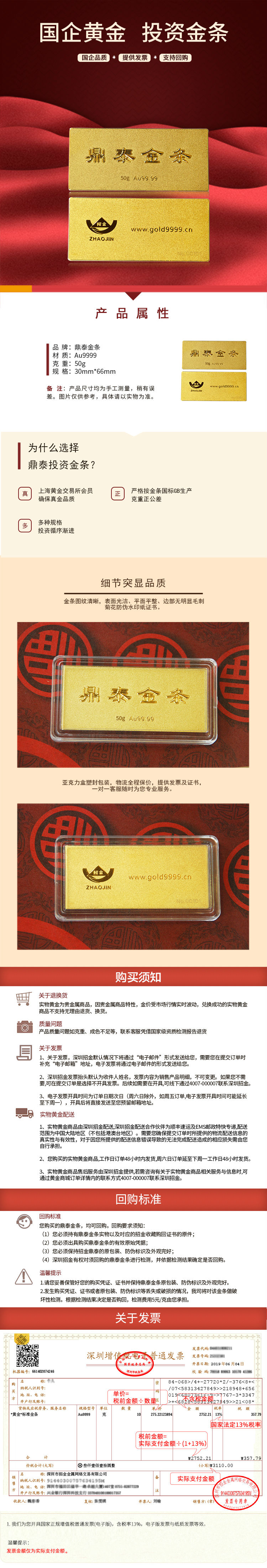 • 商品名稱:招金 Au9999鼎泰投資金條50克 投資保值收藏